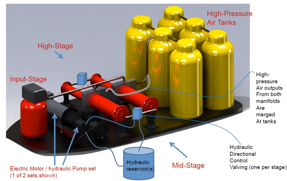 StorWatts is a scalable, modular energy storage platform that can be based on ubiquitous and proven fluid power technologies combined with high-efficiency, quiet, and emission-less electric motors. There can be five major components of the storage system and each of these is available as a plug-and-play module: (1) storage vessel, (2) compressor (3) expander (4) power port, and (5) self-configuring control block. The compressor, expander, power port, and control block can be collectively housed in a cabinet called the converter. StorWatts owns the design and advancement of the intellectual property for the converter.